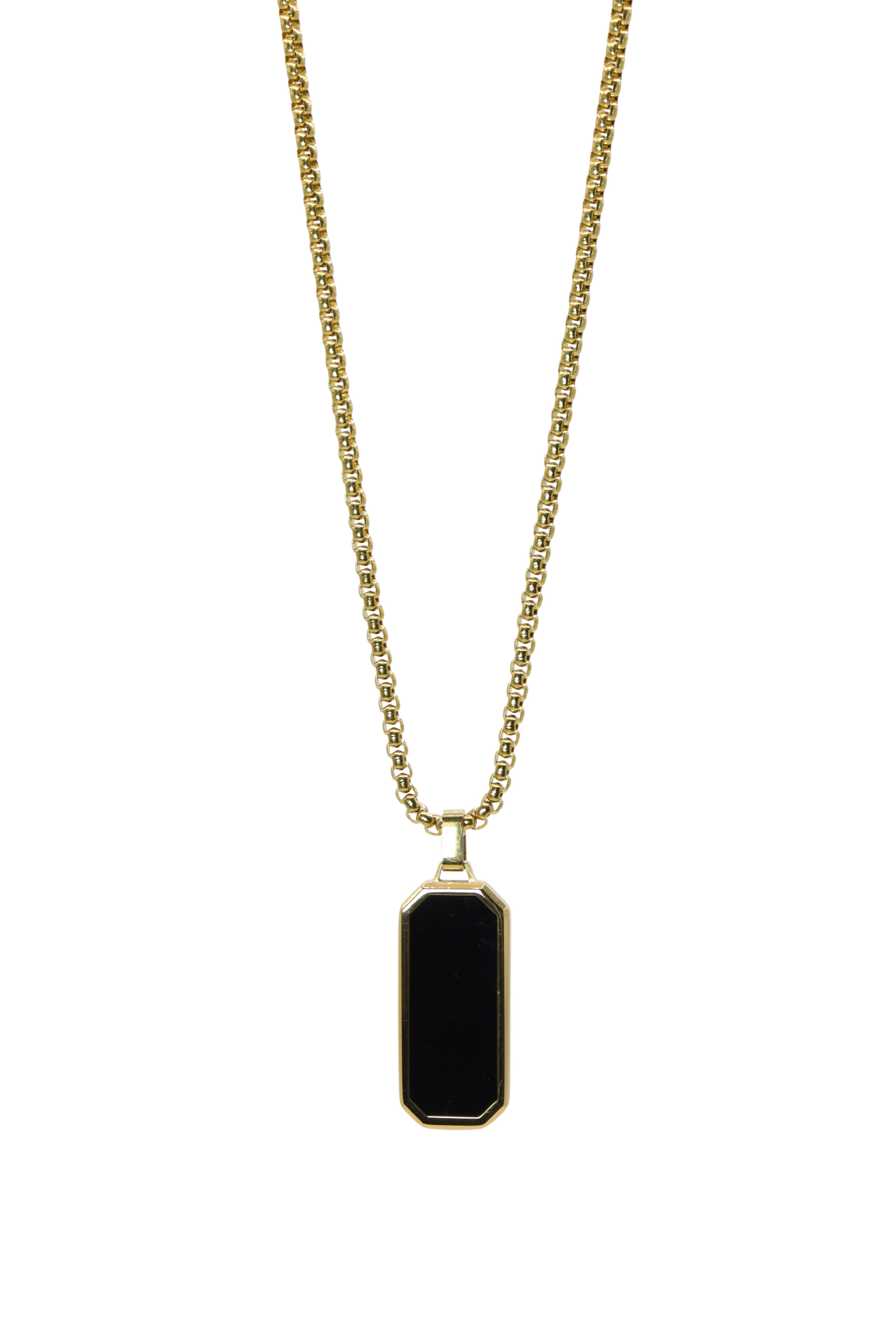 Resalta por su diseño limpio y fuerte combinando una cadena de 55 cm con un dije rectangular de 3 cm que aporta elegancia y presencia sin perder la sobriedad.